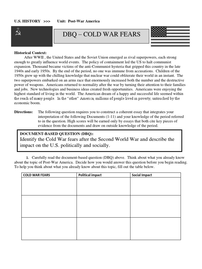 Only time can tell and America has the will to face this problem. Cite this Cold War Fears DBQ Cold War Fears DBQ. Cold War Fears DBQ. Accessed May 19, This is just a sample. You can get your custom paper from our expert writers. All you need to do is fill out a short form and submit an order. See Pricing. What's Your Topic? Hire a Professional Writer Now. The input space is limited by symbols.