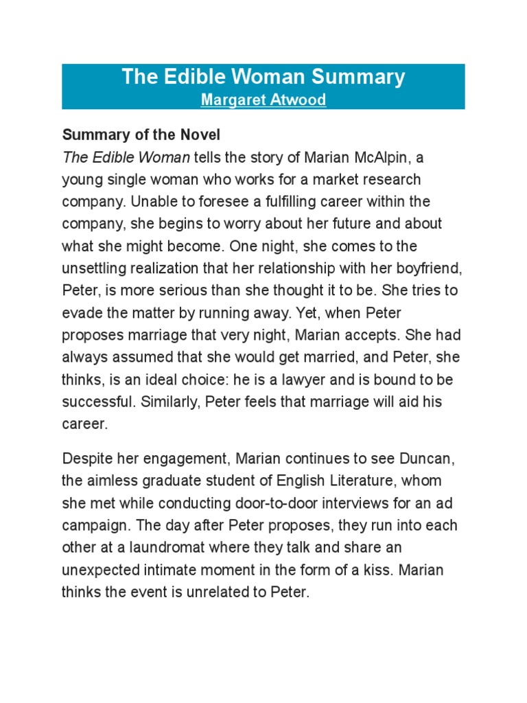 The Edible Woman written by Margaret Atwood is about women and their relationships to men, to society, to food and to eating. In chapter 22, Marian and Duncan are invited to dine at Trevor's (Duncan's friend) apartment 10/12/ · In “the edible woman- by Margaret Atwood, language also serves to develop mood. Therefore Atwood develops, plot, character and mood, through her writing style and language. We Will Write a Custom Essay Specifically. For You For Only $/page! order blogger.comted Reading Time: 1 min 10/3/ · The Edible Woman Essay THE EDIBLE WOMAN CHAPTERS 1 – 4 CHARACTERS Marian McAlpin: the protagonist. Marian copes with her roommate Ainsley's radical ideas. Marian copes with Peter's moods, adjusting her emotions around his. She copes with a boring job, a snoopy landlady, a sloppy apartment