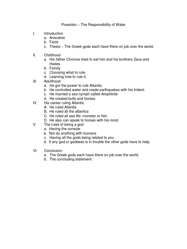 Poseidon essays Poseidon, according to Greek mythology was the god of the sea, earthquakes, and horses. He also held his own appointed position among the great gods on Olympus. Although he was officially one of the supreme gods of Mount Olympus, he spent most of Jan 03, · Poseidon is the brother of Demeter, Hades, Hera, Hestia and Zeus. Zeus banished him to the underwater kingdom. Then Poseidon hurled huge waves at Zeus’ kingdom on Mount Olympus. He was unable to reach the kingdom, so he threw the waves at the land Dec 19, · Poseidon Essay 9/24/13 Poseidon Poseidon is one of the many Greek gods in ancient history that is set apart from the many others. He is considered the most disruptive and destructive god of all time. He is the god sea, and is responsible for many storms, earthquakes, and tsunami’s